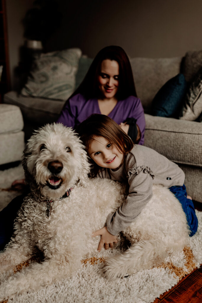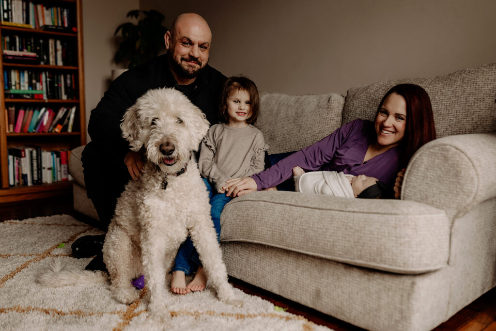 Baby Florence, lovingly called Fizzy, Fizz, and Fizzer, was a milk-guzzling champ and perfectly content soaking up all the cuddles. And of course, we can’t forget Lucille, the family dog, who made sure she was right in the middle of everything. These everyday moments are what make in-home newborn sessions so meaningful.